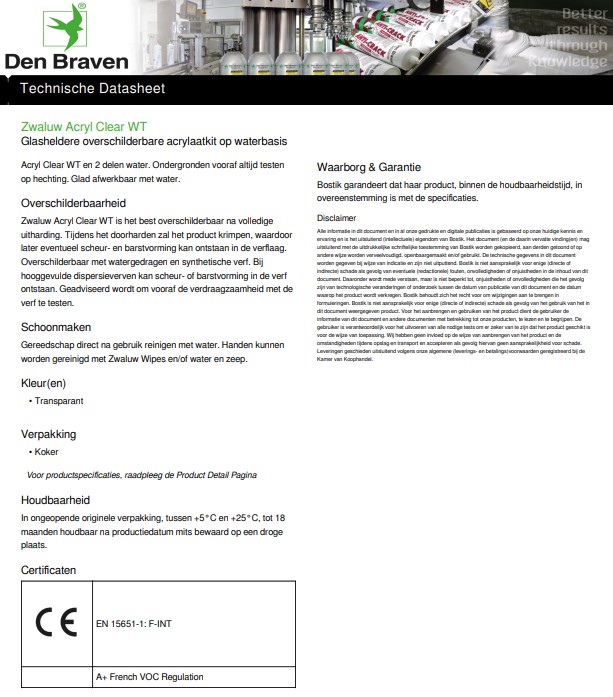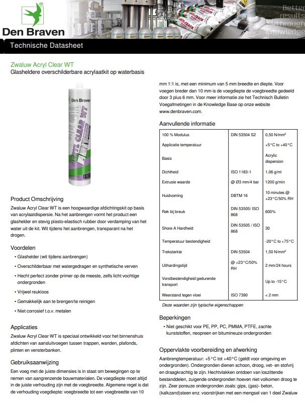 Zwaluw Acryl Clear WT is een hoogwaardige afdichtingskit op basis van acrylaatdispersie. Na het aanbrengen vormt het product een glashelder en stevig plasto-elastisch rubber door verdamping van het water uit de kit. Wit tijdens het aanbrengen, transparant na het drogen.