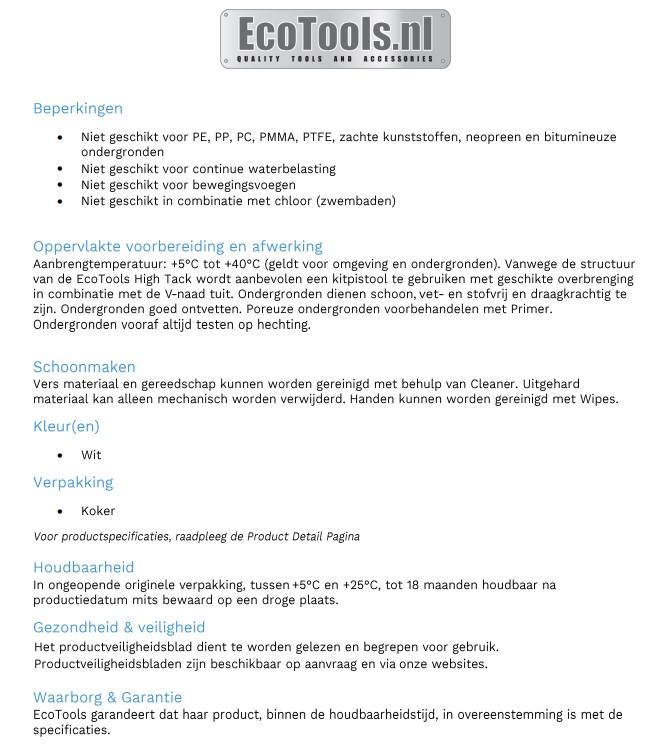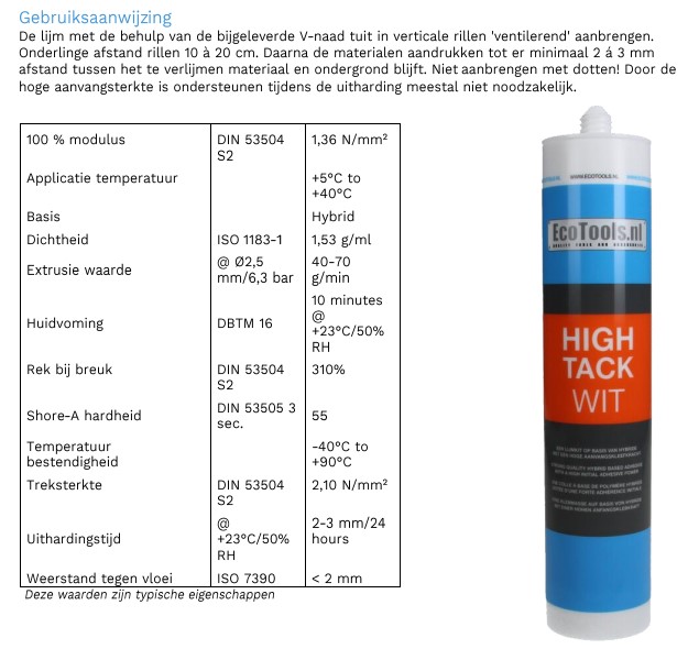 EcoTools High Tack is een lijmkit op basis van hybride met een hoge aanvangskleefkracht. Deze universele constructie- en montagelijm is geschikt voor vele bouwmaterialen