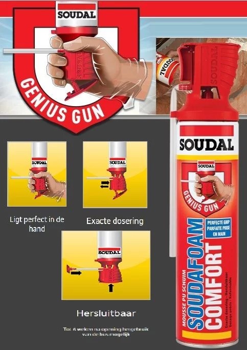 Gepatenteerd applicatiesysteem dat erg goed in de hand ligt en dat perfect doseerbaar en hersluitbaar is. Herbruikbaar tot 6 weken na de eerste gebruik. Uitermate geschikt voor het monteren van ramen en deuren, opvullen van holle ruimten, afdichten van openingen in dakconstructies en het aanbrengen van akoestische schermen. Is volledig CFK-vrij.