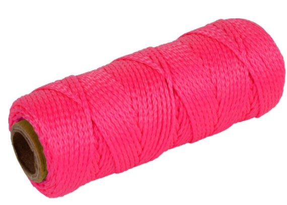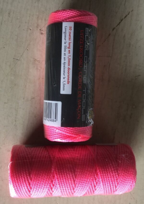 Voor het perfect recht krijgen van het koord is het gebruik van een waterpas aan te raden. Door de fluorescerende roze kleur valt het uitzetkoord extra op.